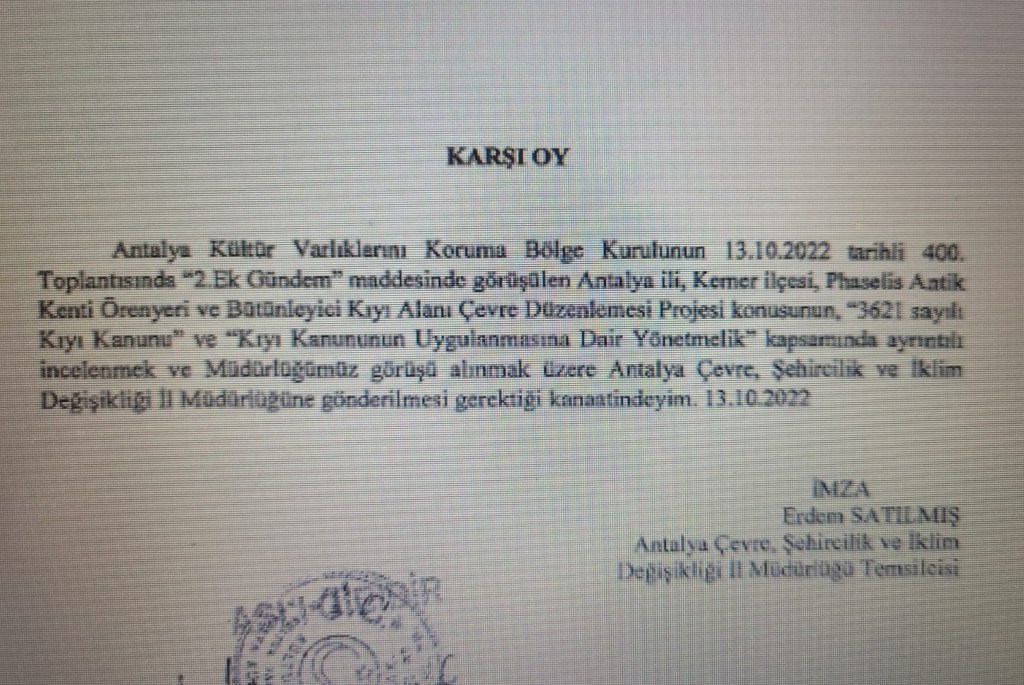 Projeyle ilgili Kurul kararında karşı oy kullanan Çevre, Şehircilik ve İklim Değişikliği Bakanlığı temsilcisinin gerekçesinde ise Phaselis’te uygulamaya konulmak istenen projenin 3621 Sayılı Kıyı Kanunu ile Kıyı Kanununun Uygulanmasına Dair Yönetmelik kapsamında ayrıntılı incelenmesi gerektiği belirtiliyor. Kurum temsilcisinin karşı oy gerekçesinde ayrıca projenin ilgili mevzuat kapsamında ayrıntılı incelenmesi için Çevre, Şehircilik ve İklim Değişikliği İl Müdürlüğü’ne gönderilmesi gerektiğine değiniliyor.