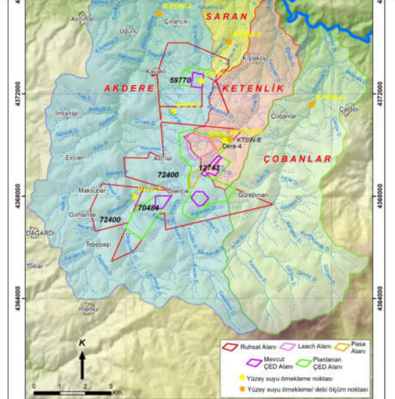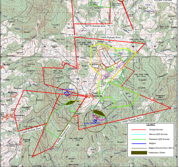 (Altın ve gümüş madeni için verilen ruhsatın kapladığı alan ve ÇED alanını yansıtan harita ile proje sahasında bulunan jeolojik miras mağaraların bulunduğu konumları yansıtan harita, altta. ÇED raporunda alınmıştır):
