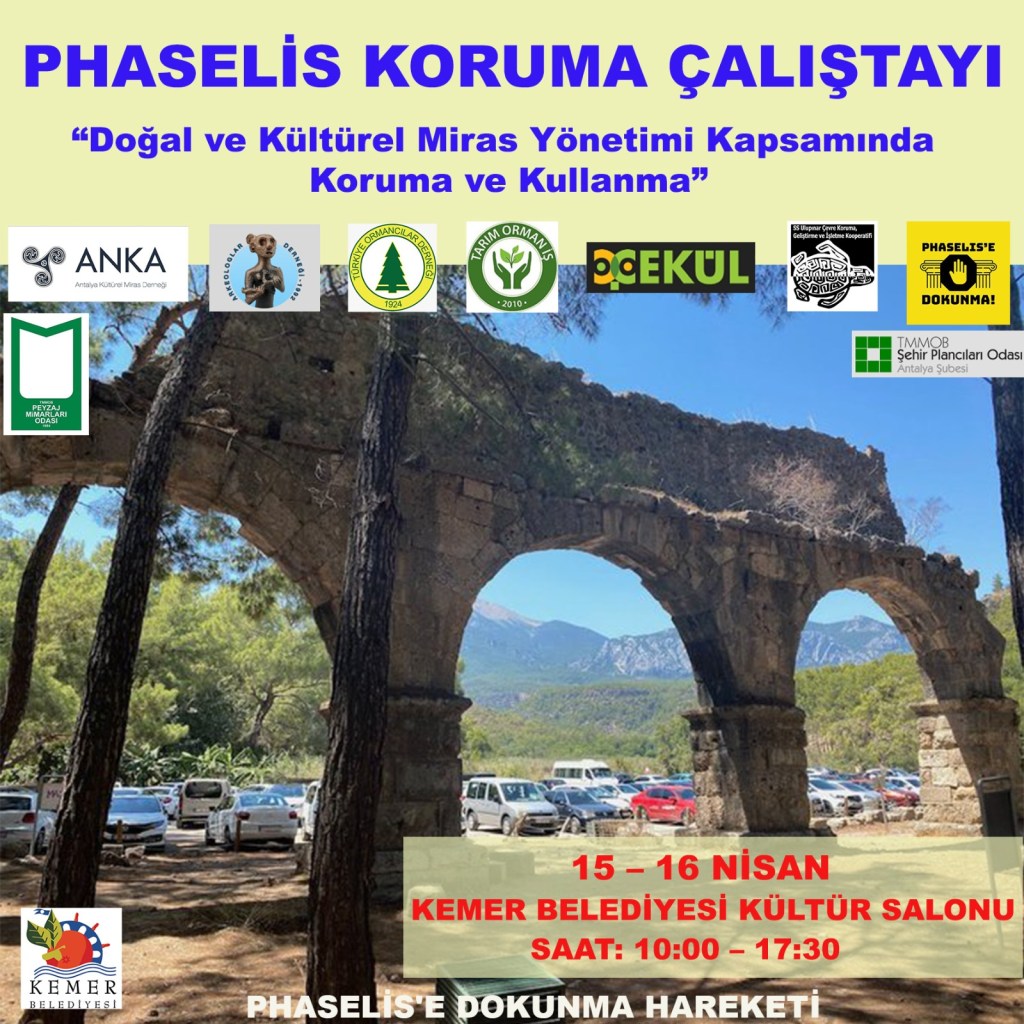 Phaselis’e Dokunma Hareketi’nin öncülüğünde organize edilen çalıştay, 15-16 Nisan tarihlerinde Kemer ilçesinde gerçekleştirilecek. Kemer Belediyesi’nin de destek verdiği çalıştaya, Antalya Kültürel Miras Derneği, TMMOB Peyzaj Mimarları Odası, Arkeologlar Derneği, Türkiye Ormancılar Derneği, Tarım Orman-İş Sendikası, ÇEKÜL Vakfı, S.S Ulupınar Çevre Koruma Geliştirme ve İşletme Kooperatifi, TMMOB Şehir Plancıları Odası Antalya Şubesi temsilcileri katılacak.