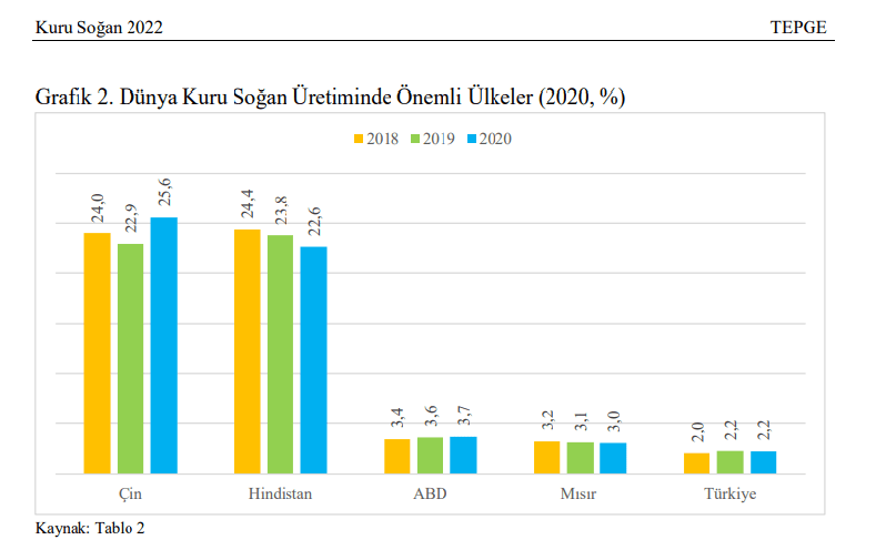 Kişi başına tüketimin yılda 21 kilogram düzeyinde olduğu Türkiye, soğan üretiminde kendi kendine yeterliliği olan ülkelerden biri. Yani sorun üretimde değil. Bakan Kirişçi değinmese de, Tarım ve Orman Bakanlığı bünyesindeki Tarımsal Ekonomi ve Politika Geliştirme Enstitüsü (TEPGE) Kasım 2022’de yayımladığı ‘Kuru Soğan Raporu’, aslında bu konuda nerede hata yapıldığını ortaya koyuyor. Rapora göre Türkiye’de 68 ilde kuru soğan üretimi yapılıyor. Ülkenin hemen her bölgesi kuru soğan üretimi için elverişli iklim ve arazi koşullarına sahip. Üretimde öne çıkan iller Ankara, Çorum, Amasya, Hatay, Tokat, Eskişehir, Adana, Konya, Bursa ve Gaziantep olarak sıralanıyor.