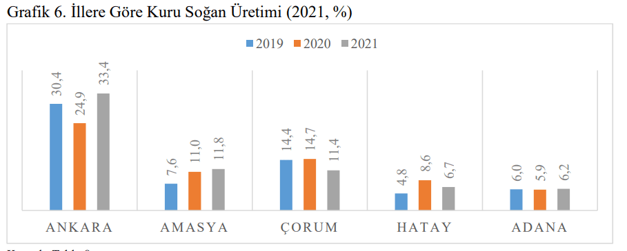 Türkiye’de 2021’de üretilen kuru soğan miktarı 2,5 milyon ton. Bunun 835 bin tonunu tek başına Ankara üretmiş. Türkiye 2011’de 108 bin ton kuru soğan ihraç ederken bu rakam 2019’da 78 bin tona gerilemiş. 2021-2022 sezonunda ise 296 bin ton soğan ihracatı gerçekleşmiş. Türkiye’nin soğan ihraç ettiği ülkelerin başında Irak ve Birleşik Arap Emirlikleri (BAE) geliyor. Gürcistan, Rusya ve Suriye gibi ülkeler de soğan ihraç edilen ülkeler arasında.