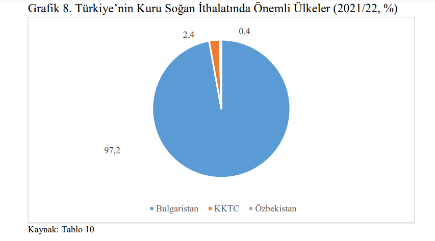 Türkiye’nin soğan ithal ettiği ülkelerin başında komşu Bulgaristan, Özbekistan ve yavru vatan Kuzey Kıbrıs Türk Cumhuriyeti geliyor. Bakanlık raporunda da altı çizildiği gibi fiyat artışını dengelemek için sıklıkla ithalat yoluna başvurulması yerine yerli üreticiye verilen desteklerin artırılması çok daha kalıcı bir çözüm olacak. Resmi verilere göre 2017’de üretici kuru soğanı 52 kuruştan, 2018’de 73 kuruştan sattı. Üretici fiyatı 2021’de 1 lira 36 kuruşa, 2022’nin ilk yarısında ise 1 lira 81 kuruş olarak kaydedildi.