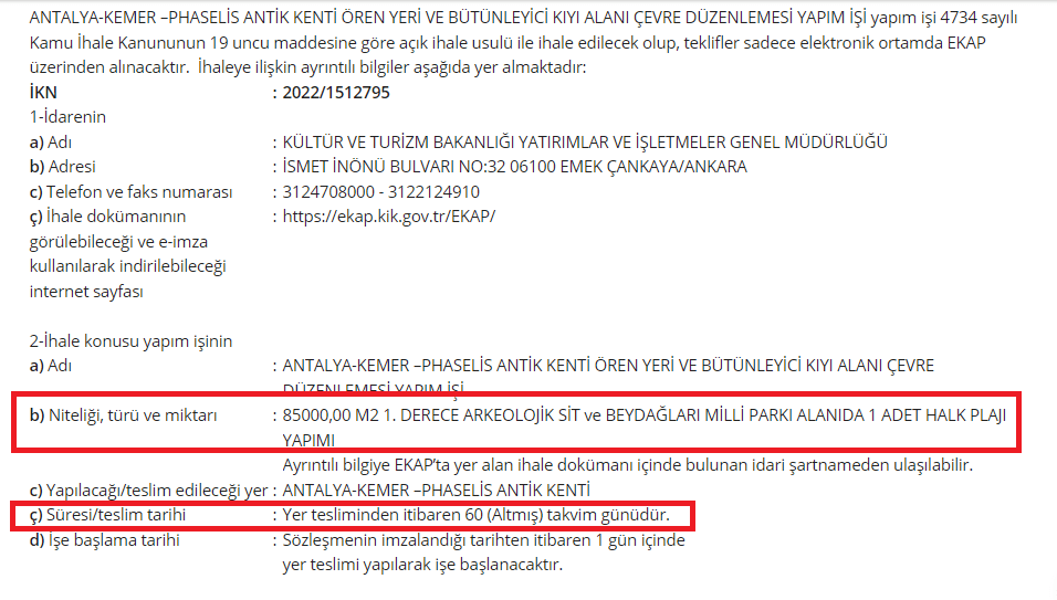 Öte yandan Phaselis’te uygulamaya konulan proje için ihale sözleşmesinde belirtilen 60 günlük yapım süresi 14 Nisan’da doldu. Bakanlık, yüklenici firmaya 14 Şubat 2023 tarihinde yer teslimi yapmıştı. Ancak yörede yaşayanlar tarafından yargıya taşınan projenin yapım işleri halen devam ediyor. İhale dosyasına göre 85 bin metrekarelik alanda uygulanacağı belirtilen projenin Ramazan Bayramına yetiştirileceği açıklanmıştı ancak Bayrama sayılı günler kala proje henüz tamamlanmadı.