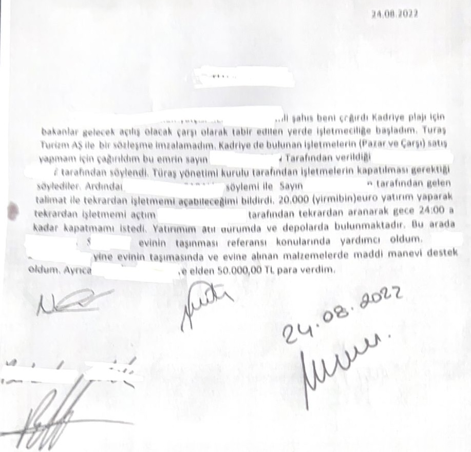 TURAŞ’ın eski genel müdürü Şimşek’in açıkladığı belgeler arasında kurumdaki rüşvet çarkını gözler önüne seren banka dekontları ve tutanaklar da yer alıyor. TURAŞ’a bağlı Antalya Serik’teki Kadriye Halk Plajı’nda yapılan incelemede ortaya çıkan yolsuzluk ve rüşvet tutanakla kayıt altına alındı. 24 Ağustos 2022 tarihli tutanakta, plajda işletmecilik yapak üçüncü şahıslardan kurum yöneticilerinden birine 50 bin lira elden para verildiği belirtiliyor. Aynı tutanakta Bakan Yardımcısı Nadir Alparslan’ın talimatıyla işletmeler açılıp kapatıldığı iddiasına yer veriliyor.