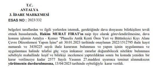 Kültür ve Turizm Bakanlığı’nın 47 milyon artı KDV bedelle 30 Ocak’ta ihale ettiği halk plajı projesi, Phaselis antik kentinin koruma sınırları içerisinde yer aslan ve 1. derece arkeolojik sit alanı statüsündeki Alacasu ve Bostanlık koylarını kapsıyor. Yörede yaşayan vatandaşlar ile meslek odalarının yargıya taşıdığı proje hakkında Antalya 3. İdare Mahkemesi 13 Nisan’da yürütmeyi durdurma kararı verdi. Mahkemenin yürütmeyi durdurma kararı, projeye dayanak oluşturan 13 Ekim 2022 tarihli Koruma Kurulu kararını kapsıyor. Ancak yargı sürecine rağmen jandarma ve komandolar eşliğinde inşaatın devam etmesi ve seçime kadar bitirileceği belirtilmesi tepki çekiyor.