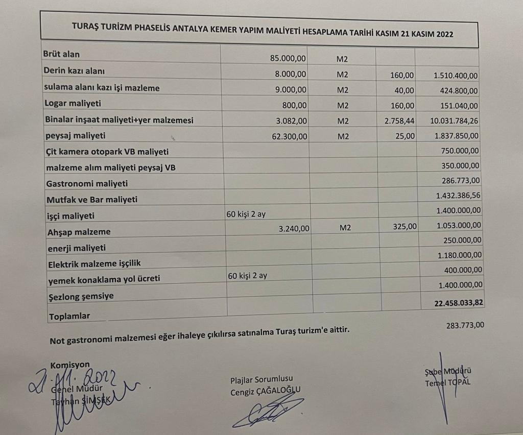 Son günlerde gündemden düşmeyen Phaselis antik kentindeki halk plajı inşaatı ve ihale süreciyle ilgili de açıklamalarda bulunan TURAŞ’ın eski genel müdürü Şimşek, görev yaptığı dönemde hazırladığı yaklaşık maliyet çalışmasında projenin 22 ila 25 milyon civarında bütçesi olduğunu belirterek, “TURAŞ’ın geçmişte kendi yaptığı plajlar da var. Bu plajı biz yaparsak maliyeti ne olur gibi bir çalışma yaptık. O çalışmada da ben daha önceki yaptığımız plajlarla ilgili elimizde doneler vardı, bunlardan yola çıkarak şirketlerden teklifler aldık. Bir maliyet çalışmasıydı. Bu çalışmada Phaselis’te yapılması 22 ila 25 milyon TL tutarında bir maliyet hesapladık. Benim şirketlerden aldığım teklifler EKAP’a girilmiş resmi teklifler değil.”