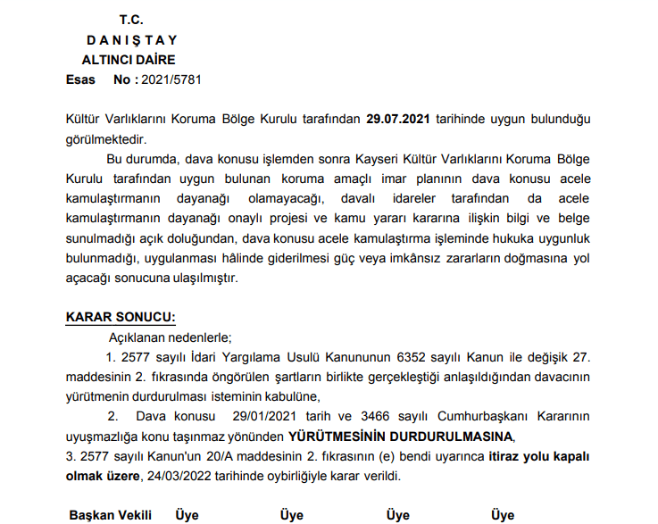 Niğde’de kentsel dönüşüm başlatılan Kale Mahallesindeki yapıların yıkımına dayanak teşkil eden acele kamulaştırmalara ilişkin Cumhurbaşkanı kararının iptali için mülk sahiplerinin açtığı iptal davaları Danıştay’da görüldü. Danıştay 6. Dairesi, davalı idarelerden acele kamulaştırma kararına dayanak oluşturan planın gönderilmesini istedi. Ancak acele kamulaştırma kararından tam 6 ay sonra hazırlanan planın gönderilmesi üzerine Danıştay bu planın acele kamulaştırma kararına dayanak oluşturamayacağına hükmederek 24 Mart 2022 tarihinde Cumhurbaşkanı Kararı’nın yürütmesini durdurdu.