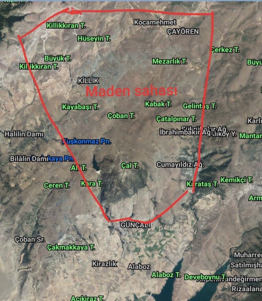 Çevre, Şehircilik ve İklim Değişikliği Bakanlığı’na dilekçe ile başvuruda bulunan yöre halkı, maden arama çalışmasının durdurulmasını talep ediyor. Konuyla ilgili yapılan başvuruda, maden arama süreci ve sonrasında açılması planlanan işletme ve üretim sahalarının köy yerleşimleri, tarım arazileri ve yeraltı sularını olumsuz etkileyeceği belirtilerek şöyle denildi: “Ruhsat alanı Günçalı, Killik, Çayören, köyleri hudutlarını içermekte olup komşu köylerimizden olan Güzelce, Kervansaray, köyleri ile Çamlıbel civarındaki köylerin yanında Yeşilyurt, Sulusaray hatta çekerek istikametine yer alan köylerde etkileneceğini düşünüyoruz. Çünkü bu hat üzerindeki sulama yapılan tarım arazilerini besleyen Güzelce Barajı yer almaktadır.