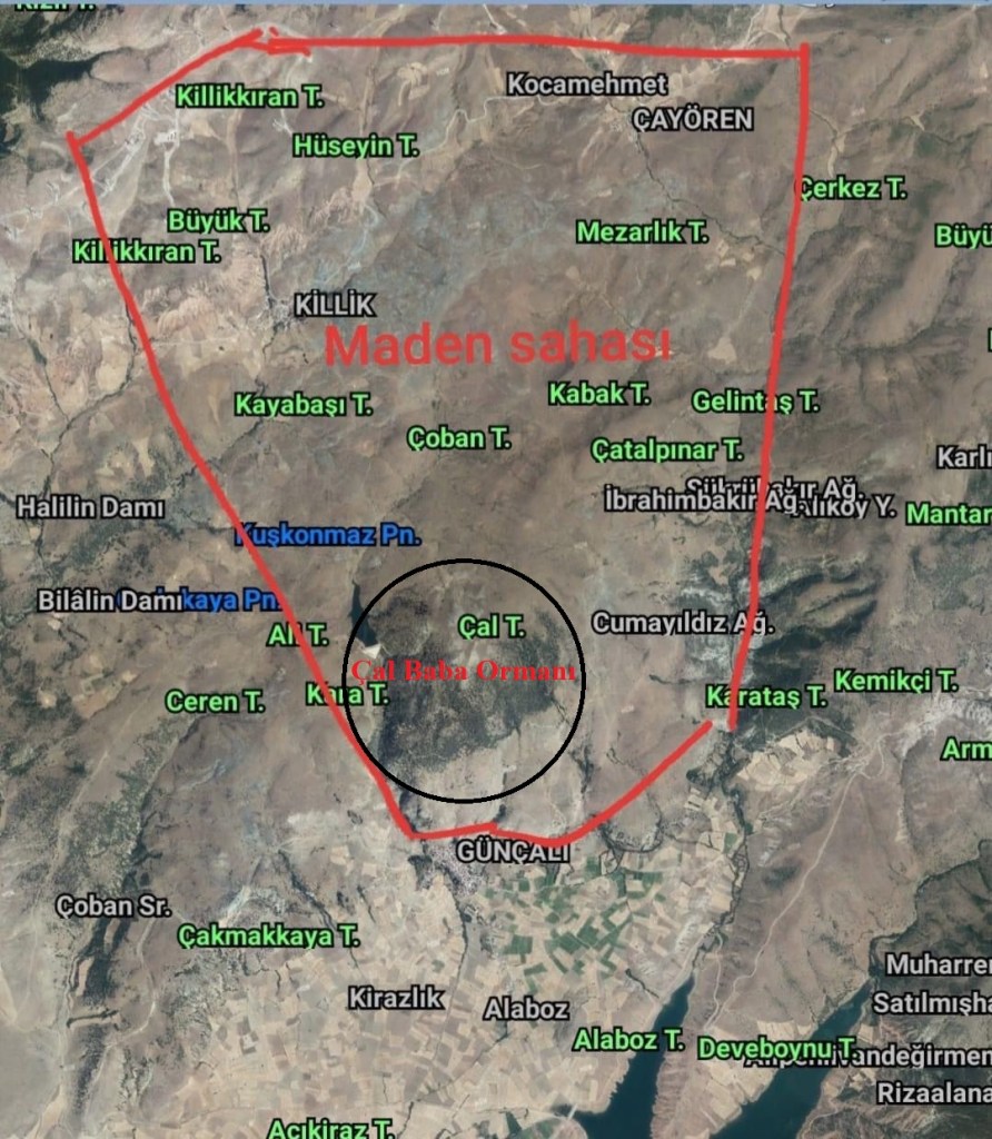 (Değerli maden aranması için özel bir firmaya verilen ruhsatın kapsadığı alan, Çal Baba ormanı dahil çok sayıda köyün sınırlarını etkiliyor)