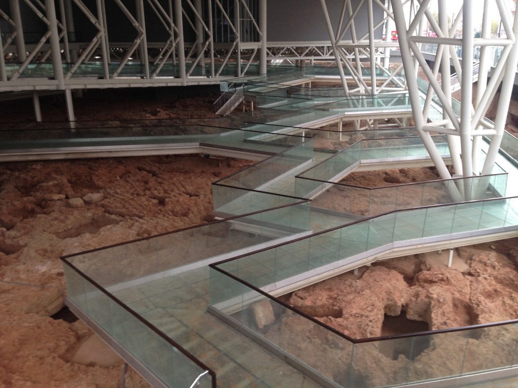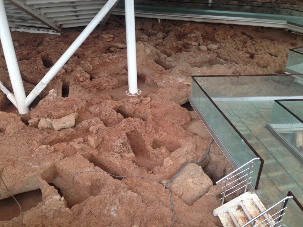 (Altta, Doğu Garajı bölgesindeki ticaret ve kültür merkezi inşaatı sırasında ortaya çıkan ve kentin tarihini değiştiren nekropol ve üzerinde yükselen yapıdan görünüm):