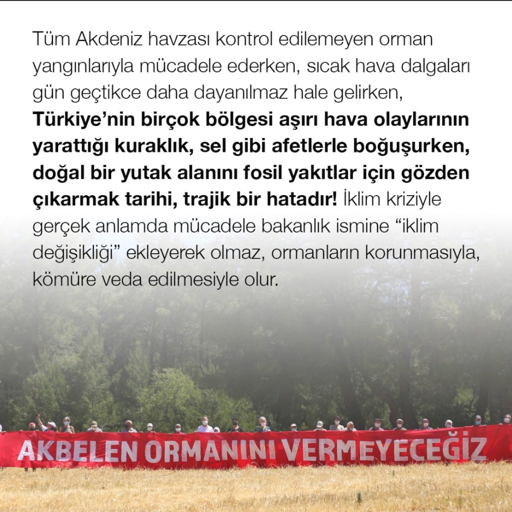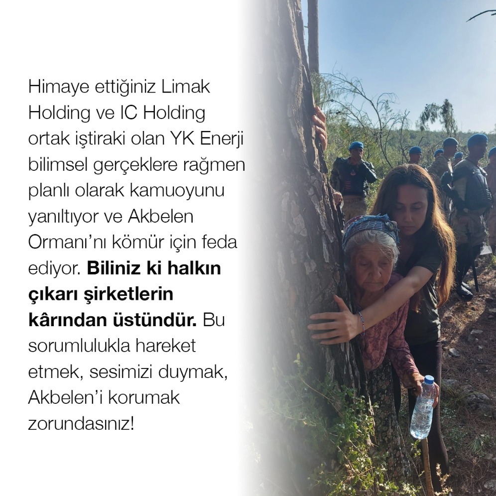 “İktidara sesleniyoruz” ifadesiyle süren açıklamada, şu görüşlere yer verildi: “Himaye ettiğiniz Limak Holding ve IC Holding ortak iştiraki olan YK Enerji bilimsel gerçeklere rağmen planlı olarak kamuoyunu yanıltıyor ve Akbelen Ormanı’nı kömür için feda ediyor. Biliniz ki halkın çıkarı şirketlerin kârından üstündür. Bu sorumlulukla hareket etmek, sesimizi duymak, Akbelen’i korumak zorundasınız! Tüm Akdeniz havzası kontrol edilemeyen orman yangınlarıyla mücadele ederken, sıcak hava dalgaları gün geçtikçe daha dayanılmaz hale gelirken, Türkiye’nin birçok bölgesi aşırı hava olaylarının yarattığı kuraklık, sel gibi afetlerle boğuşurken, doğal bir yutak alanını fosil yakıtlar için gözden çıkarmak tarihi, trajik bir hatadır! İklim kriziyle gerçek anlamda mücadele bakanlık ismine ‘iklim değişikliği’ ekleyerek olmaz, ormanların korunmasıyla, kömüre veda edilmesiyle olur.