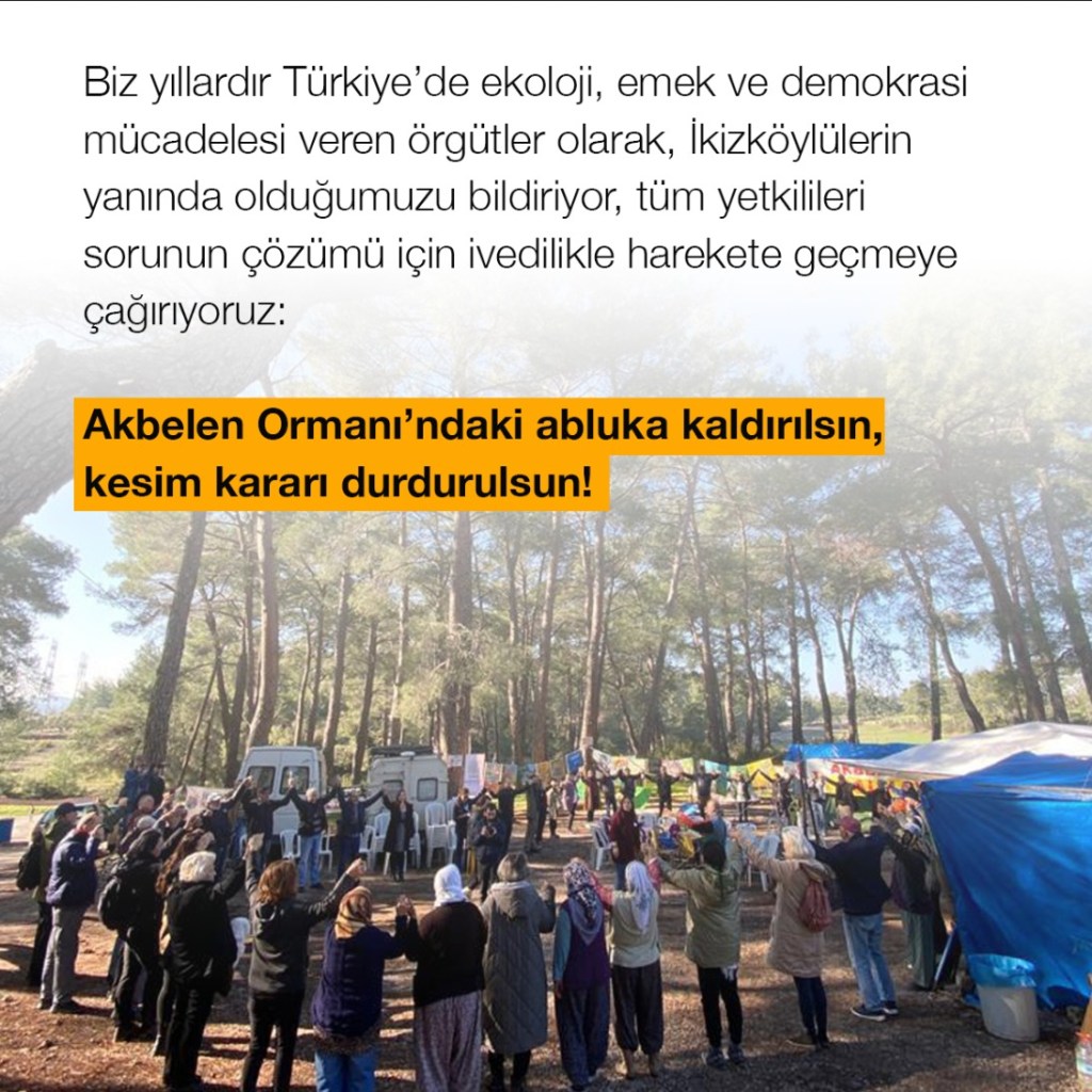 Ülke olarak bilimsel olmayan ve ekosistem yararını öncelemeyen çevre politikaları nedeniyle kirlilik ve sağlık problemleriyle boğuşuyor, doğa tahribatının artması ile gıda güvencesizliği ve ekonomik problemlerle karşı karşıya kalıyor, afetlere açık hale gelen yaşam alanlarımızda büyük bir tedirginlikle yaşıyoruz. Biz yıllardır Türkiye’de ekoloji, emek ve demokrasi mücadelesi veren örgütler olarak, İkizköylülerin yanında olduğumuzu bildiriyor, tüm yetkilileri sorunun çözümü için ivedilikle harekete geçmeye çağırıyoruz: Akbelen Ormanı’ndaki abluka kaldırılsın, kesim kararı durdurulsun! Protesto hakkını kullanarak ormanı ve yaşam alanlarını korumaya çalışanlara yönelik uygulanan şiddete ve gözaltı kararlarına son verilsin! Akbelen Ormanı’ndan vazgeçmiyoruz, yaşamı ve doğayı savunuyoruz!”