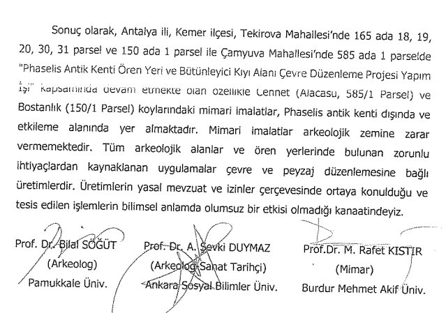 Pamukkale Üniversitesi’nden Arkeolog Prof. Dr. Bilal Söğüt, Ankara Sosyal Bilimler Üniversitesi’nden Sanat Tarihi uzmanı Prof. Dr. Abdullah Şevki Duymaz ve Burdur Mehmet Akif Ersoy Üniversitesi’nden Prof. Dr. Mehmet Rafet Kıstır (Mimar) tarafından hazırlanan raporun sonuç bölümünde şu ifadelere yer veriliyor: “Her iki koydaki mimari imalatların bulunduğu alanın SİT durumu bir antik yerleşim dokusundan daha ziyade birinci derece arkeolojik sit alanı koruma bandını oluşturacak yer konumundadır. İnceleme alanının proje uygulama aşamasında özellikle arkeolojik alanın olumsuz etkilerinin ortaya çıkması durumunda yasal mevzuata göre ilgili kurumların müdahalesi zaten söz konusu olacaktır. Proje uygulama aşamasında tescilli alanlara fiziki müdahale koşulları yasa ve yönetmeliklere tabi olarak yürütülüyor ve tescilli alanların tescil niteliği yasal koruma devamlılığı içerisindedir. Sonuç olarak ‘Phaselis Antik Kenti Ören Yeri ve Bütünleyici Kıyı Alanı Çevre Düzenlemesi Projesi’ yapım işi kapsamında devam etmekte olan özellikle Cennet ve Bostanlık koylarındaki mimari imalatlar, Phaselis antik kenti dışında ve etkileme alanında yer almaktadır. Mimari imalatlar arkeolojik zemine zarar vermemektedir. Tüm arkeolojik alanlar ve ören yerlerinde bulunan zorunlu ihtiyaçlardan kaynaklanan uygulamalar çevre ve peyzaj düzenlemesine bağlı üretimlerdir. Üretimlerin yasal mevzuat ve izinler çerçevesinde ortaya konulduğu ve tesis edilen işlemlerin bilimsel anlamda olumsuz bir etkisi olmadığı kanaatindeyiz.”