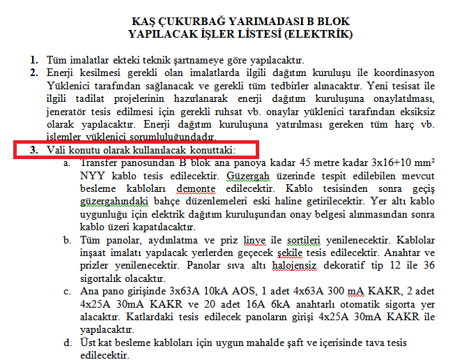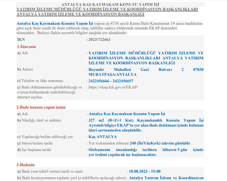 Yaklaşık 3 yıldır kiracı konumunda bulunan Kaş Kaymakamı için yeni bir konut yapmak isteyen Antalya Valiliği Yatırım İzleme ve Koordinasyon Başkanlığı (YİKOB), bugün bir ihale yapacak. Eski Kaymakamlık konutunun yaklaşık 350 metre doğusundaki makilik ve yamaç arazide inşa edilmesi planlanan 327 metrekarelik yeni kaymakamlık konutu bodrum artı iki kattan oluşacak. Kaş Merkez Mahallesi, 23 ada-203 parselde bulunan taşlık ve kayalık arazide inşa edilmesi planlanan kaymakam evi ile ilgili yapım ihale 10 Ağustos 2023 tarihinde saat 15.00’de Antalya YİKOB binasında gerçekleşecek. İhale dosyasında yer alan bilgilere göre Kaş Kaymakamlığı için inşa edilmesi planlanan konutun yapım süresinin yaklaşık 8 ay olacağı belirtiliyor.