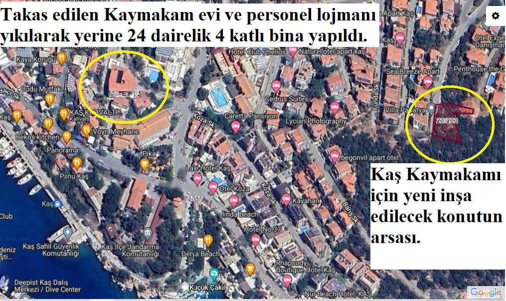 (Kaş Kaymakamlığı konutu ve personel lojmanı, en üstte ve yıkılmadan önce. Üstte ise kamu taşınmazlarıyla takas edilen villalardan biri görülüyor.)