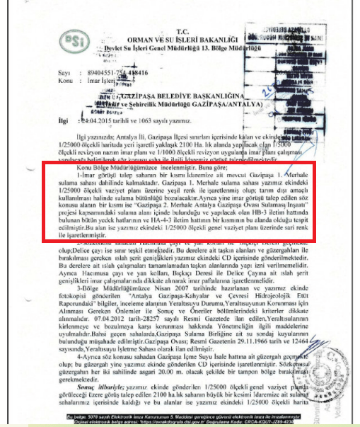 Plan raporunda ayrıca DSİ 13. Bölge Müdürlüğü’nün 2015 ve 2020’de verdiği görüşler de yer alıyor. DSİ’nin plan revizyonu yapılmak istenen alana ilişkin görüşünde, “İmar görüşü talep edilen sahanın bir kısmı İdaremize ait mevcut Gazipaşa 1. Merhale sulama sahası dâhilinde kalmaktadır. Gazipaşa 1. Merhale sulama sahası, yazımız ekinde 1/25.000 ölçekli vaziyet planı üzerine yeşil renk ile işlenmiş olup, tarım dışı kullanılması halinde sulama bütünlüğü bozulacaktır” deniliyor.