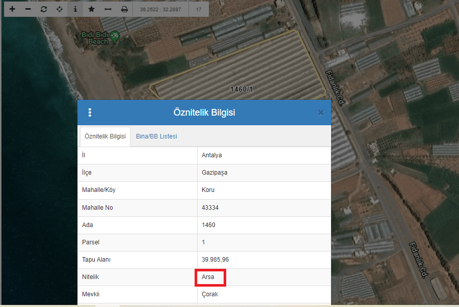 (Gazipaşa Koru Mahallesi Fidanlık Caddesi’nin denizden taraftaki bölümünde tapu kaydında ‘arsa’ niteliğinde olan ancak üzerindeki seralarda tarımsal üretim yapılan arazilerden biri.)