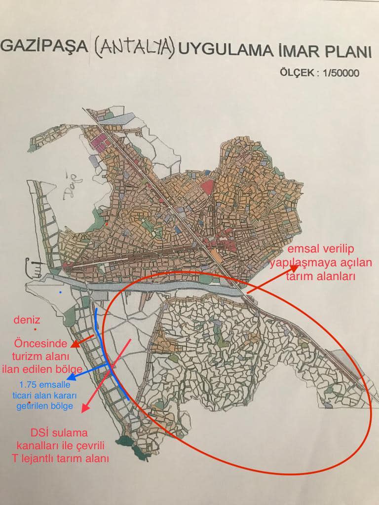 Gazipaşa Belediyesi’nin DSİ’nin görüşüne “üst ölçekli planlara uymadığı” gerekçesiyle itiraz etmesinin ardından Büyükşehir Yasası’nın tarım arazileri üzerindeki baskıyı nasıl artırdığına ilişkin bir gerçekle karşı karşıya kalınıyor. DSİ’nin 3 Temmuz 2020 tarihli bir başka görüşünde, planlama alanında kalan sulama sahası ve taşkın koruma sahası dışında kalan alanların imara açılmasında bir sakınca görülmediği kaydediliyor.