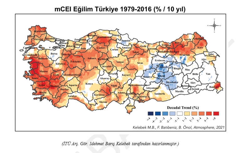 İklim ekstrem indeksinin Avrupa’daki ve Akdeniz Bölgesi’ndeki 10 yıllık eğilimlerini de inceleyen makale, iklim ekstremlerindeki artışın 21. yüzyılın ilk yarısından itibaren giderek hızlandığını ve 2010 yılında en üst seviyeye çıktığını ortaya koyuyor. 2010 yılı aynı zamanda Türkiye’de de meteorolojik kayıtlara göre şu ana kadar ölçülmüş en sıcak yıl. İndeksteki artış eğilimi haritalandırıldığında ise Türkiye ve çevresinin, Kuzey ve Batı Avrupa’ya göre çok daha ciddi biçimde etkilendiği açıkça ortaya çıkıyor. Özellikle Akdeniz kıyılarının, Avrupa’nın kalanına kıyasla iklim ekstremlerine çok daha fazla maruz kaldığı görülüyor. Bu iki veri, ekstrem iklim olayları sebebiyle risk altındaki alanların belirlenmesini kolaylaştıracak nitelikte.