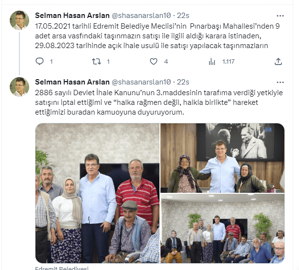 Pınarbaşı köylülerinin basın açıklaması ve protesto eyleminin ardından ihalenin iptaliyle ilgili talepler Belediye yetkililerine iletildi. Bu gelişmelerin ardından sosyal medya hesabından bir açıklama yapan Edremit Belediye Başkanı CHP’li Hasan Selman Arslan, tepki çeken satış ihalesinin iptal edildiğini duyurdu. Belediye Başkanı Arslan, açıklamasında şu ifadelere yer verdi: “Edremit Belediye Meclisi’nin Pınarbaşı Mahallesi’nden 9 adet arsa vasfındaki taşınmazın satışı ile ilgili aldığı karara istinaden, 29.08.2023 tarihinde açık ihale usulü ile satışı yapılacak taşınmazların 2886 sayılı Devlet İhale Kanunu’nun 3.maddesinin tarafıma verdiği yetkiyle satışını iptal ettiğimi ve ‘halka rağmen değil, halkla birlikte’ hareket ettiğimizi buradan kamuoyuna duyuruyorum.”
