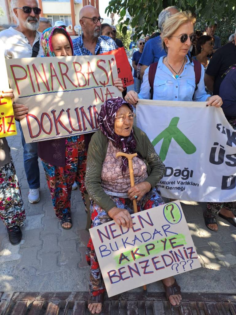 Pınarbaşı köylüleri olarak, bu satışı, zeytinliklerimizin idam fermanı olarak görüyoruz. Köyümüzün rant uğruna yapılaşmaya açılmasını istemiyoruz. Bu konuda dilekçelerimizi biraz önce Belediye Başkanlığı’na verdik. Buradan belediye yetkilerine bir kez daha sesleniyoruz: İmar rantından vazgeçin ve Köylülerimizin geçim kaynağı, doğal ve bacasız fabrika olan zeytinliklerimizin satış ihalesini iptal edin ve zeytinliklerimizi bize bırakın. Havama, suyuma, zeytinime dokunma!”