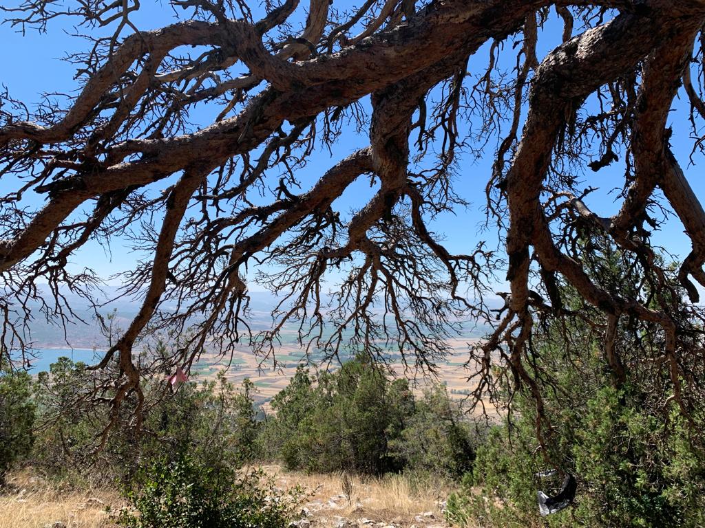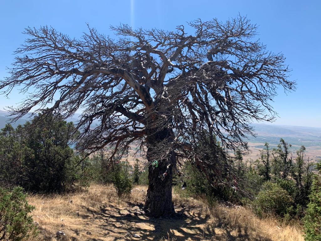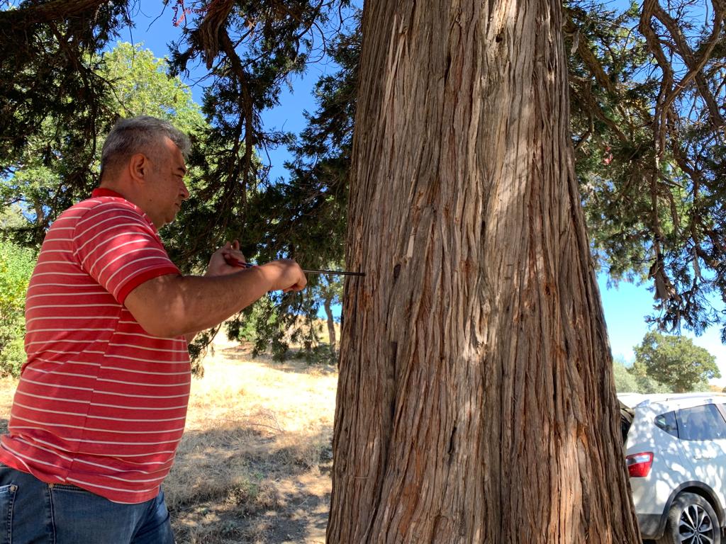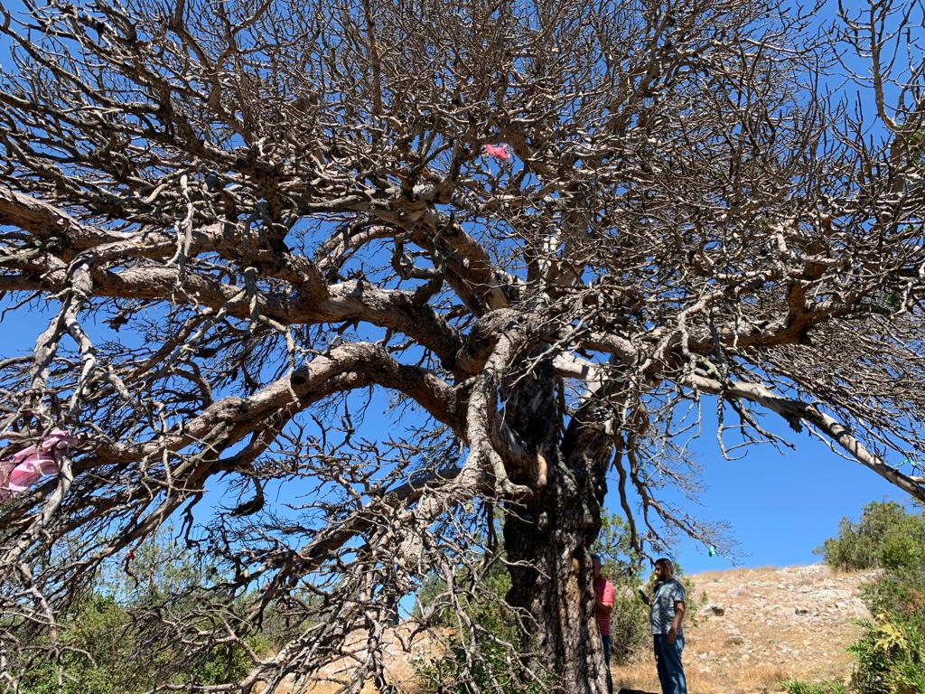 (Orman Yüksek Mühendisi Dr. Mehmet Ali Başaran’ın yaptığı çalışmalara göre Çal Baba ormanında yaşları 230 ila 500 arasında değişen çok sayıda anıtsal nitelikte ağaç tespit edildi. Fotoğraflar, ‘Ziyaret’ olarak anılan bölgedeki boylu ardıç ağacını yansıtıyor.)