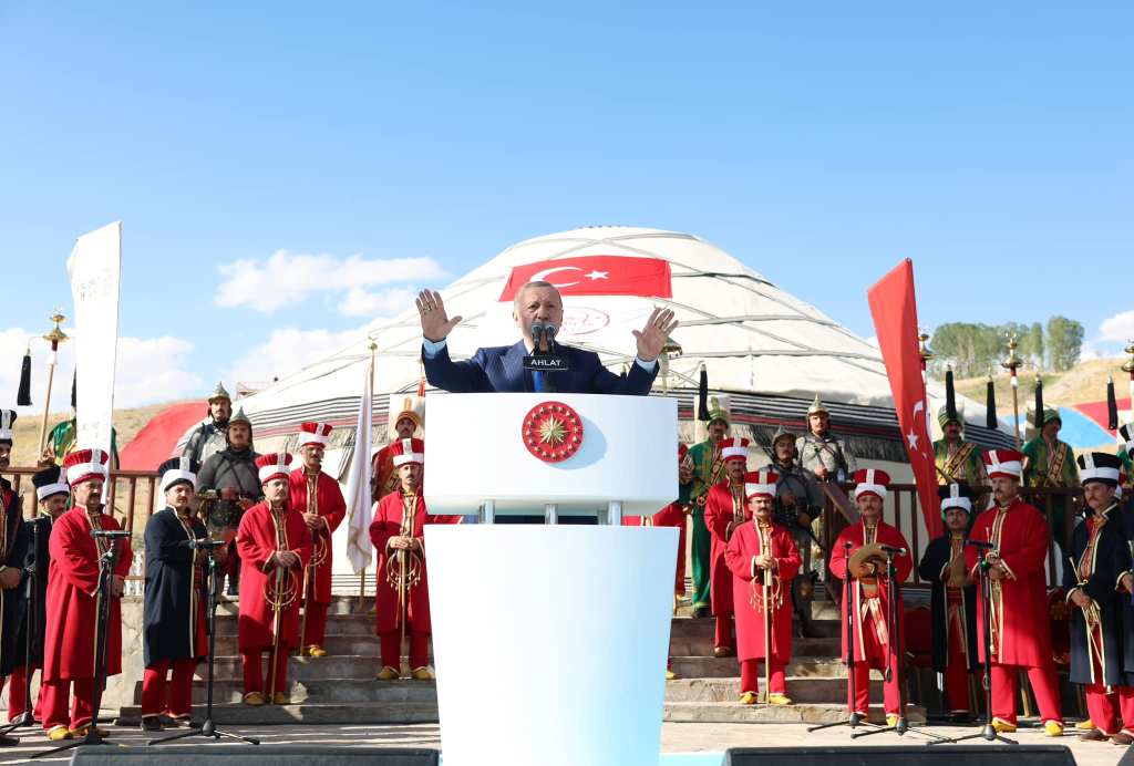 (Cumhurbaşkanı Erdoğan ve MHP lideri Devlet Bahçeli’nin Malazgirt Zaferinin yıldönümü kutlamalarında Ahlat buluşmasından görüntüler.):
