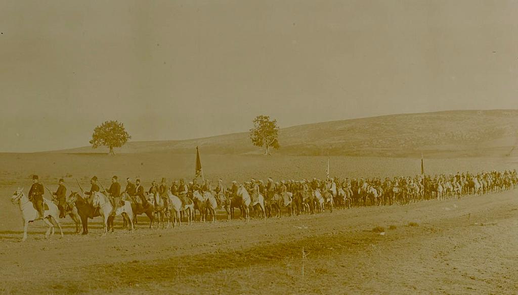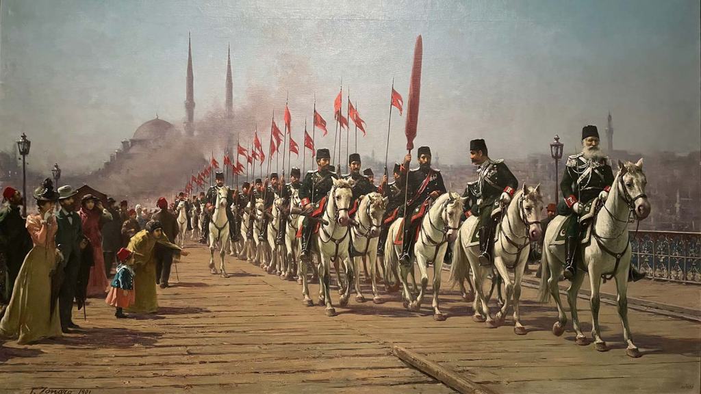 (Sultan II. Abdülhamid döneminde saray ressamı olan İtalyan Fausto Zonaro’nun 1901 tarihli ‘Ertuğrul Süvari Alayı Köprüde’ adlı tablosu. Ertuğrul Süvari Alayı, Sultan II. Abdülhamid tarafından Söğüt ve çevresindeki Karakeçili Yörüklerinden seçilen gençlerden oluşturulmuştu.)