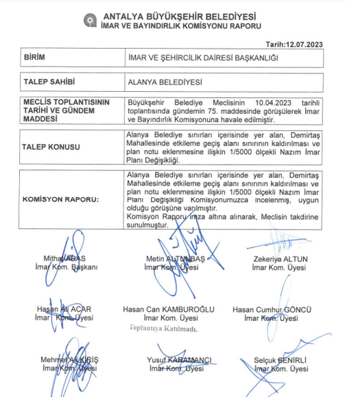 Meclis gündeminin 7. Maddesinde yer alan Alanya Belediyesi’nin Demirtaş Mahallesi’nde yapmak istediği 1/5 bin ölçekli Nazım İmar Planı Değişikliği talebi, Antalya Büyükşehir Belediyesi İmar Komisyonu tarafından 12 Temmuz 2023 tarihinde ‘uygun’ bulunarak Meclis’e havale edildi. Plan değişikliği raporunda yer verilen bilgilere göre, Demirtaş sahilindeki bölge deniz kaplumbağalarının yuvalama kumsallarından biri olduğu için Nisan 1999’da 1. Derece doğal sit alanı olarak koruma altına alındı. Ancak Kurul kararına açılan dava sonucu İdare Mahkemesi’nce sit kararı iptal edildi.