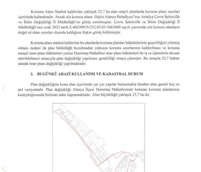 Önce 1. Dereceden 3. Dereceye düşürülen koruma kararları, daha sonra Çevre, Şehircilik ve İklim Değişikliği Bakanlığı’nca yapılan güncellemelerle bir kez daha değiştirildi. Yapılan düzenlemeyle 3. Derece sit alanının sınırları daraltılarak Nitelikli Doğal Koruma Alanı olarak tescil edilirken, etkileme geçiş alanı da Sürdürülebilir Koruma ve Kontrollü Kullanım Alanı olarak tescil edildi. Bu düzenlemelerin ardından korunan alan sınırlarının değişmesiyle birlikte korunan alan sınırlarının dışında kalan yaklaşık 23,7 hektarlık arazi için imar planı değişikliğine giden Alanya Belediyesi, imar rantının oldukça yüksek olduğu bu bölgede, Demirtaş Mahallesi’ndeki mevcut Nazım İmar Planı hükümlerinin geçerli olacağı kaydediliyor. Çevre, Şehircilik ve İklim Değişikliği Bakanlığı’nın da, planlamaya konu 23,7 hektarlık alanın “doğal sit alanı dışında kaldığı” yönünde görüş bildirmesinin ardından yapılaşmaya açılabilecek.