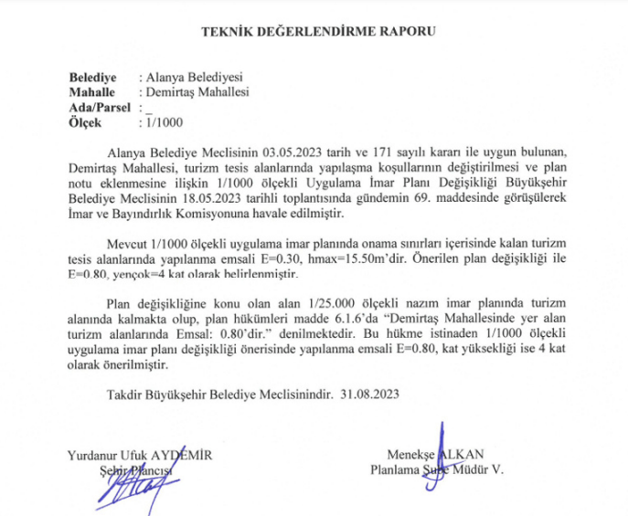 Aynı şekilde Antalya Büyükşehir Belediyesi’nin Eylül ayı gündemine alınan 28. Madde de Alanya Belediyesi’nin Demirtaş Mahallesi’ndeki söz konusu araziler üzerindeki turizm tesis alanı yapılaşma koşullarının değiştirilmesi talebini içeriyor. Buna göre plan üzerinde TAKS (taban alanı katsayısı) oranı belirlenmemiş bölgelerde “TAKS oranı yüzde 20’yi aşamaz” ibaresinin, “TAKS oranı yüzde 30’u aşamaz” şeklinde değiştirilmesi talep ediliyor. Alanya Belediye Meclisi’nin 3 Mayıs 2023 tarihli oturumunda itirazlar eşliğinde ve oy çokluğu ile aldığı değişiklik talebi, Antalya Büyükşehir Belediyesi İmar Komisyonu tarafından 6 Eylül 2023 tarihinde uygun bulunarak Meclis’e havale edildi. Emsal oranı yüzde 80, kat yüksekliği ise 4 olarak belirlenen düzenleme ile Demirtaş sahilinde yeni otel inşaatları yükselmesinin önü açılacak.