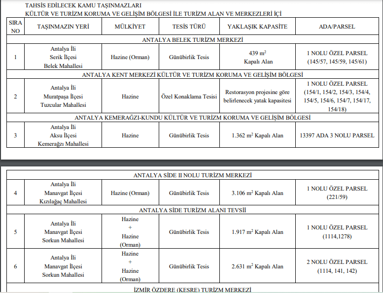 Antalya’nın tarihi kent merkezi olan Kaleiçi’nin yanı sıra Aksu (Kemerağzı), Manavgat (Kızılağaç ve Sorgun) Serik’te ise Belek bölgesinde yer alan orman arazisi tahsis edilecek. İzmir’in Seferihisar, Menderes ve Selçuk ilçeleriyle, Kırşehir’in il merkezinde, Muğla’nın Bodrum, Ordu’nun Kabadüz, Trabzon’un ise Akçaabat ilçelerinde bulunan kamuya ait taşınmazlar turizm amaçlı tahsis edilmesi planlanan yerler arasında.