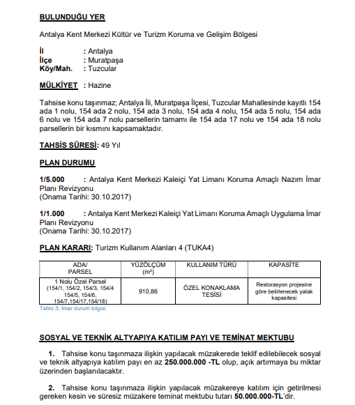 Bakanlığın tahsis listesinde bulunan Antalya’nın Muratpaşa ilçesi Tuzcular Mahallesi’ndeki (Kaleiçi) toplam 9 parsel, en yüksek bedel üzerinden artırmaya sokulacak taşınmaz olarak belirlendi. Tarihi kent surlarının bitişiğinde bulunan ve kentsel sit alanı içerisinde kalan parseller üzerindeki tescilli yapılarla birlikte en az 250 milyon TL başlangıç bedeliyle yerli ve yabancı turizm yatırımcılarına tahsis edilecek. Tahsis edilecek taşınmazların yatak kapasitesinin ise restorasyon projesine göre belirleneceği kaydediliyor.