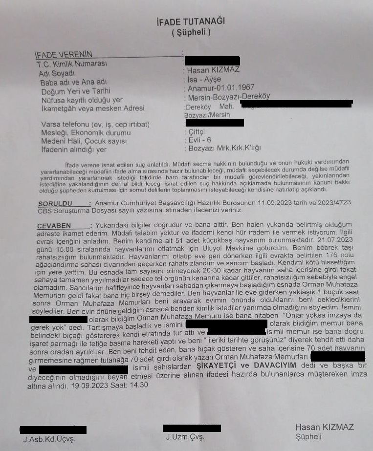 Anamur Cumhuriyet Başsavcılığı tarafından yürütülen soruşturma kapsamında Mersin Bozyazı Jandarma Karakol Komutanlığı’nda ifadesi alınan Çoban Hasan Kızmaz, kendisine 728 bin TL para cezası kesilmesine ve suç duyurusu yapılmasına neden olan olayla ilgili yaşananları anlattı. Kendisinin 51 adet küçükbaş hayvanı (keçi) olduğunu dile getiren Kızmaz, 21 Temmuz 2023 tarihinde hayvanlarını otlatmak için Uluyol Mevkii’ne götürdüğünü belirterek şunları dile getirdi: