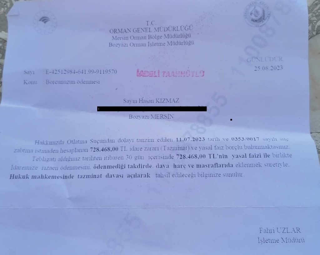 Bozyazı Orman İşletme Müdürlüğü tarafından Hasan Kızmaz’a gönderilen tebligatta ise otlatma suçundan dolayı düzenlenen suç zaptına istinaden 728.668,00 TL para cezası borcu bulunduğu belirtilerek şu ifadelere yer verilmişti: “Sayın Hasan Kızmaz, Hakkınızda otlatma suçundan dolayı tanzim edilen 11.07.2023 tarih ve 0353/0017 sayılı suç zaptına istinaden hesaplanan 728.668,00 TL idare zararı (tazminat) ve yasal faiz borçlu bulunmaktasınız. Tebligatı aldığınız tarihten itibaren 30 gün içerisinde 728.468,00 TL’nin yasal faizi ile birlikte idaremize rızaen ödenmesini, ödenmediği takdirde dava, harç ve masrafları da eklenmek suretiyle Hukuk Mahkemesi’nde tazminat davası açılarak tahsil edileceği bilginize sunulur.”