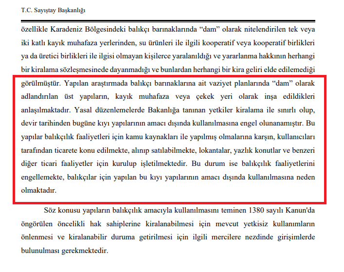 Sayıştay’ın Eylül 2023 tarihli denetim raporunda, “Su ürünleri avcılığı ve yetiştiriciliği ile ilgili hizmetlerin yerine getirilmesi amacıyla yapılan balıkçı barınakları ve üst yapıların yararlanma hakkının, su ürünleri ile ilgili kişiler yerine ilgisiz kişilerce kullanıldığı tespit edilmiştir” denildi.