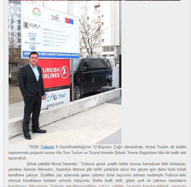 (Kırsal turizm başlığı altında verilen destekle Trabzon kent merkezinde Yomra’da inşa edilen lüks otel. TKDK, amaç dışına çıkılan destekle inşa edilen oteli kendi resmi web sayfasında da böyle duyurdu)