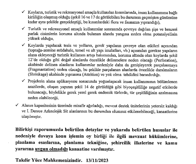 Phaselis davalarının birleştirilmesiyle nihai kararı verecek olan Antalya 3. İdare Mahkemesi’nin proje alanında yeniden keşif yapılmasını istemesi üzerine geçtiğimiz Temmuz ayında uzmanlardan oluşan bilirkişi heyeti yerinde inceleme yaptı. Hazırlanan bilirkişi raporu geçtiğimiz hafta Mahkemeye sunuldu. Bilirkişi raporunda projenin ilgili mevzuata ve ilke kararına aykırı olduğu, uygulanması durumunda doğal ve kültürel mirasa verilecek zararlar ayrıntılarıyla ortaya konuldu.