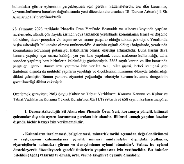 Antalya Kültür Varlıkları Koruma Bölge Kurulu’nun Phaselis projesi konusundaki tutumuna da eleştiriler getirilen açıklamada, “Açtığımız davalara bakan Antalya 3. İdare Mahkemesinin görevlendirdiği bilirkişi heyetinin raporunda, hem arkeolojik, hem kıyı kenar, hem milli park hem de nesli tehlikedeki canlılarla ilgili mevzuatlara aykırı olduğu ortaya konan bu garabet projeye Koruma Kurulunun nasıl olup da izin verdiğini tartışmak zamanı artık gelmiştir. Kurulda çok sayıda çok değerli bilim insanı ve bürokrat vardır ve tüm bu yasa dışılıkları bilmedikleri düşünülemez. Üstelik bu ilke kararları ve yasa maddeleri her kişi tarafından farklı yorumlanabilecek, yoruma açık muğlak maddeler değildir. Ancak Bakan Ersoy’un bu konuda kendi bakanlığının kontrolünde olan Kurula aşırı baskı yaptığı da bilinen bir gerçektir. Bakan Ersoy sanki Koruma Kurulu başka bir bakanlığa aitmiş gibi konuşmakta, ‘Kurul izniyle yaptık’ diyerek garabet projesine meşruiyet zemini yaratmaya çalışmaktadır. Anlaşılan o ki, Koruma Kurulu yasalara ve kendi Yüksek Kurul İlke Kararlarına aykırı olduğunu bile bile bu izinleri vermek zorunda kalmıştır. Bu kurul kararlarının alındığı toplantılarda uygulanan mevzuata aykırı yöntemleri incelemeyi daha ilerdeki bir tarihe bırakarak, şimdilik sadece bu izinlerin yok hükmünde olduklarını ve aynı Kazı Başkanlığı gibi, Koruma Kurulunun da bakanlık eliyle uygulanan yasa dışılıklara ortak olduğunu, görevleri olan ‘koruma’ işlevine ihanet ettiklerini belirtmekle yetineceğiz” görüşüne yer verildi.