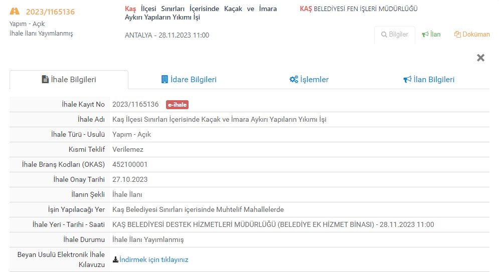 Zengin doğal ve kültürel mirasıyla Türkiye’nin en önemli turizm merkezlerinden biri olan Antalya’nın Kaş ilçesi son yıllarda plansız ve kaçak yapılaşmayla sık sık gündeme geliyor. Zeytinlikler, doğal ve arkeolojik sit alanları ve özel çevre koruma bölgelerinin de kaçak yapılaşmadan nasibini aldığı Kaş’ta 2018 yılından bu yana tespit edilen 3719 kaçak yapıyla ilgili yıkım ihalesi yapılması gündemde. AKP’li Kaş Belediyesi’nin duyurduğu yıkım ihalesine göre toplam 349 bin 601 metrekareyi bulan kaçak yapıların aşamalı olarak yıkılması planlanırken, yıkım işleminin 31 Mart 2024 tarihine kadar tamamlanması bekleniyor.