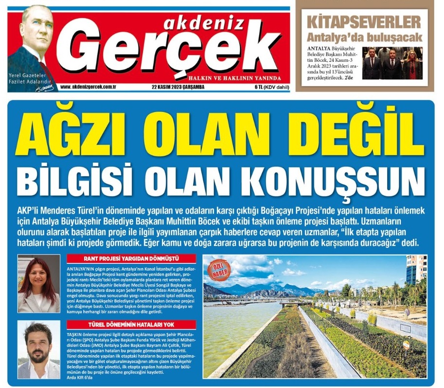Söz konusu haberde Şehir Plancıları Odası’nın Antalya Şube Başkanı Funda Yörük ile Jeoloji Mühendisleri Odası Şube Başkanı Bayram Ali Çeltik’in görüşlerine yer veriliyor. Her iki oda başkanı da özetle, Türel döneminde uygulanan Boğaçayı projesindeki hataların bu ikinci projede görmediklerini dile getiriyor ve yeni projede de bir hata olursa ona da karşı çıkacaklarını belirtiyorlar. Haberde ayrıca adı açıklanmayan bir belediye yetkilisinin de projeyi savunan sözlerine yer veriliyor. Ancak “Uzmanların olurunu alarak başlatılan proje ile ilgili yayımlanan çarpık haberlere cevap veren uzmanlar” spotuyla sunulan haberin başlığında kullanılan “Ağzı olan değil, bilgisi olan konuşsun” şeklindeki ifade, görüşü aktarılan ‘uzmanların’ değerlendirmeleri arasında yer almıyor. Bu değerlendirme de gazete yönetiminin tasarrufu olmalı. Bu üslup, kentteki eleştirel iradeyi felç etmeye yönelik bir girişim olmanın ötesinde, kamuoyunun fikrini özgürce ifade etmesine de ket vurmayı amaçlayan bir zihniyetin ürünüdür. Sonuçta Türel’in yıkım projesi döneminde de hep ‘bilgisi’ olanların konuşturulduğu bir sürecin sonunda bugün ortada duran ölüyü gömecek yer bulunamıyor.