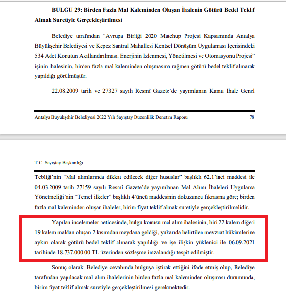 Sayıştay raporunda, biri 22, diğeri ise 19 kalemden oluşan mal alım ihalesinin iki kısımdan oluştuğuna dikkat çekilerek, mevzuat hükümlerine aykırı şekilde götürü bedel teklifi alınarak yapılan işe ilişkin yüklenici ile 6 Eylül 2021 tarihinde 18.737.000,00 TL üzerinden sözleşme imzalandığı tespit edildiği bilgisine yer verilerek, “Sonuç olarak, Belediye cevabında bulguya iştirak ettiğini ifade etmiş olup, Belediye tarafından yapılacak mal alım ihalelerinin birden fazla mal kaleminden oluşması durumunda, birim fiyat teklif almak suretiyle gerçekleştirilmesi gerekmektedir” deniliyor.