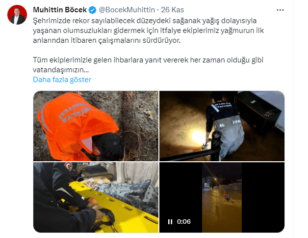 Antalya Büyükşehir Belediye Başkanı Muhittin Böcek, yağışın etkili olduğu 26 Kasım akşamı sosyal medyadan yaptığı paylaşımda, “Şehrimizde rekor sayılabilecek düzeydeki sağanak yağış dolayısıyla yaşanan olumsuzlukları gidermek için itfaiye ekiplerimiz yağmurun ilk anlarından itibaren çalışmalarını sürdürüyor” ifadelerini kullanarak kuruma bağlı ekiplerin sorunları çözmek için yoğun mesai harcadığını dile getirdi.