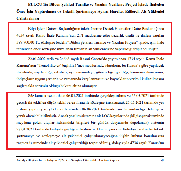 Sayıştay raporunda, Düden Şelalesi’nin girişine konulan turnike için 6 Mayıs 2021 tarihinde ihalenin, 27 Mayıs 2021’de ise yer teslimi yapıldığı belirtiliyor. Ancak yüklenici firmanın ihale tarihinden yaklaşık bir ay önce, yani 6 Nisan 2021 tarihinde işin tamamlandığını belediyeye yazılı olarak bildirdiği tespitine yer veriliyor. LOG kayıtlarında sistemin 28 Nisan 2021’de faaliyete geçtiği kaydedilen Sayıştay raporunda, “Bunun yanı sıra Belediye tarafından teknik şartnameye ve sözleşmeye alt yüklenici çalıştırılamayacağına ilişkin hüküm konulmasına rağmen iş sürecinde alt yüklenici çalıştırıldığı tespit edilmiş, dolayısıyla 4734 sayılı Kanun’un T.C. Sayıştay Başkanlığı Antalya Büyükşehir Belediyesi 2022 Yılı Sayıştay Düzenlilik Denetim Raporu 59 5’inci maddesinde belirtilen temel ilkelere aykırı hareket edilmiştir” ifadelerine yer veriliyor.