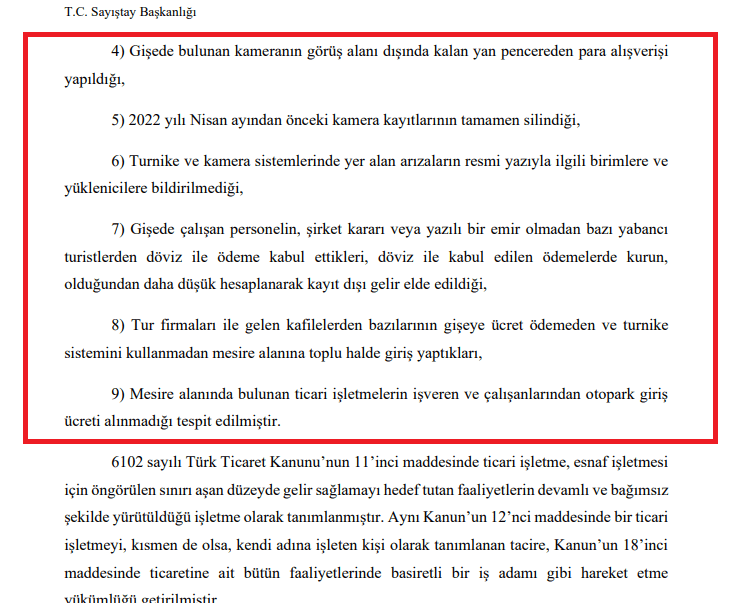 Gişede bulunan kameranın görüş alanı dışında kalan yan pencereden para alışverişi yapıldığı kaydedilen Sayıştay raporunda, “2022 yılı Nisan ayından önceki kamera kayıtlarının tamamen silindiği, Turnike ve kamera sistemlerinde yer alan arızaların resmi yazıyla ilgili birimlere ve yüklenicilere bildirilmediği, Gişede çalışan personelin, şirket kararı veya yazılı bir emir olmadan bazı yabancı turistlerden döviz ile ödeme kabul ettikleri, döviz ile kabul edilen ödemelerde kurun, olduğundan daha düşük hesaplanarak kayıt dışı gelir elde edildiği, Tur firmaları ile gelen kafilelerden bazılarının gişeye ücret ödemeden ve turnike sistemini kullanmadan mesire alanına toplu halde giriş yaptıkları, Mesire alanında bulunan ticari işletmelerin işveren ve çalışanlarından otopark giriş ücreti alınmadığı tespit edilmiştir” denildi.