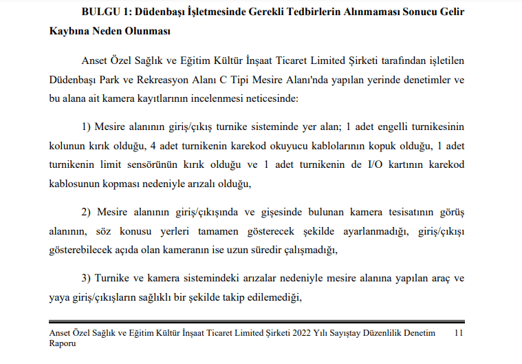 İlgili mevzuata göre bir ticari işletme olan Düdenbaşı Park ve Rekreasyon Alanı C Tipi Mesire Alanı İşletmesi’nin gelir sağlama amacı bulunduğu vurgulanan Sayıştay denetim raporunda, “Ayrıca söz konusu ticari işletmenin taciri konumunda olan, Anset Özel Sağlık ve Eğitim Kültür İnşaat Ticaret Limited Şirketi’nin de ticaretine ait bütün faaliyetlerinde basiretli bir iş adamı gibi hareket etme yükümlüğü bulunmaktadır. Ancak yukarıda belirtilen denetim tespitleri dikkate alındığında, Şirket organlarınca gerekli denetim ve gözetimin zamanında yapılmaması nedeniyle Şirketin gelir kaybına uğradığı açıktır” ifadelerine yer verildi.