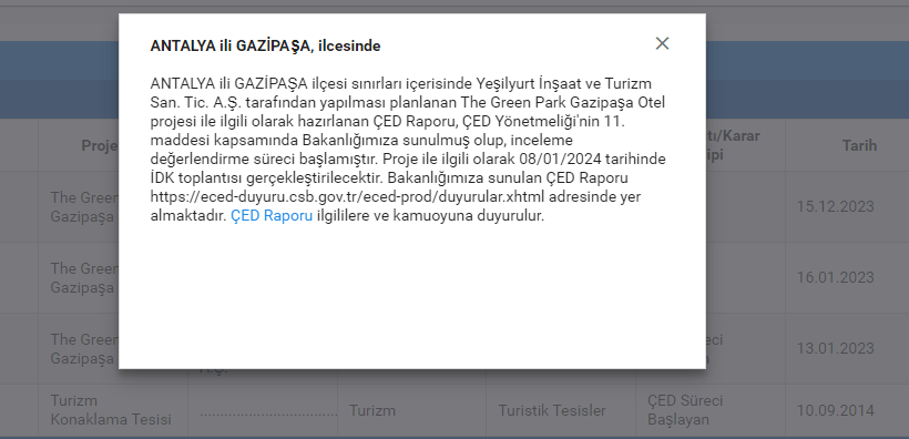 Çevre, Şehircilik ve İklim Değişikliği Bakanlığı Adil Üstündağ’a ait Yeşilyurt İnşaat ve Turizm San. Tic. A.Ş. tarafından yapılması planlanan 5 yıldızlı otel projesi için 8 Ocak 2024 tarihinde İDK toplantısı yapılacağını duyurdu.