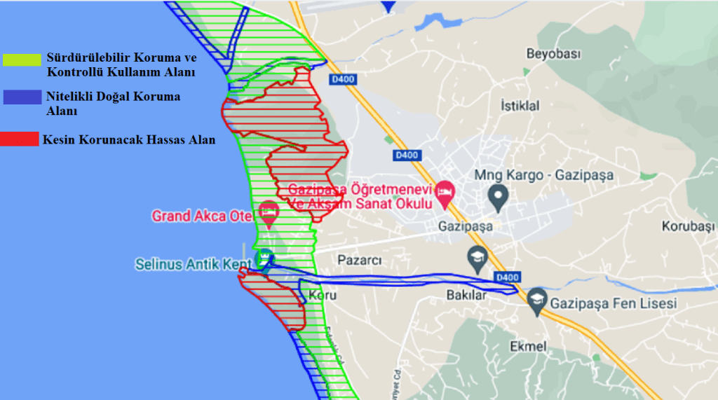 Çevre Düzeni Planında ‘Turizm Alanı’ olarak ayrılan 3. Derece doğal sit alanı statüsündeki Selinus sahilinin ortasında yer alan parselin bulunduğu araziler, imar planlarında ise otel ve günübirlik tesis alanı olarak ayrıldı. Şubat 2022’de Cumhurbaşkanı Kararı ile ‘Sürdürülebilir Koruma ve Kontrollü Kullanım Alanı’ olarak tescil edilen sahilde 2508 yatak kapasiteli 5 yıldızlı otel inşa edilecek olması, koruma-kullanma dengesinin ‘kullanımdan’ yana bozulmasına yol açacağına işaret ediyor.