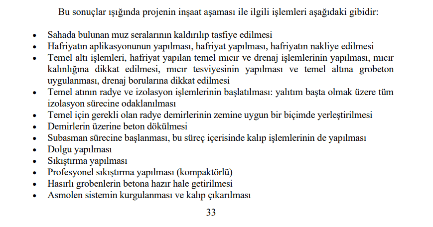 Proje dosyasında, otel inşa edilmesi planlanan arazide bulunan muz serası ve muz ağaçlarının söküleceği, arı kovanlarının ise kaldırılacağı belirtilerek şu ifadelere yer veriliyor: “Faaliyetin planlandığı tapu alanı içerisinde muz serası ve muz ağaçları bulunmakta olup faaliyete başlanılmadan önce sezonluk olarak dikimi yapılan muz serası ve muz ağaçlarının sökümü yapılacaktır. Arı kovanları geçici olarak konulmuş olup, kaldırılacaktır.”