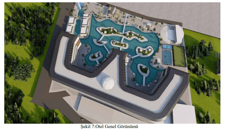 Toplam 51.260,08 m2’lik alana yayılacak olan otel için hazırlanan proje dosyasında, 7 restoran, 2 pastane, 13 adet mağaza 1 ibadethane ile SPA merkezi, düğün salonu, konferans ve gösteri salonu, çocuk oyun parkı, açık ve kapalı yüzme havuzları gibi ünitelerin inşa edilmesi planlanan otel projesi kapsamında ayrıca spor salonları, eğlence merkezi, diskotek ve kapalı otopark yapılacağı belirtiliyor.